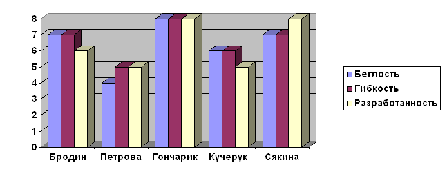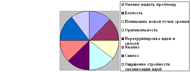 | Умение видеть пр. | Беглость | Понимание новой точки зрения | Оригинальность | Перегруппировка идей и связей | Анализ | Синтез | Ощущение стройности организации идей | ||||||||||