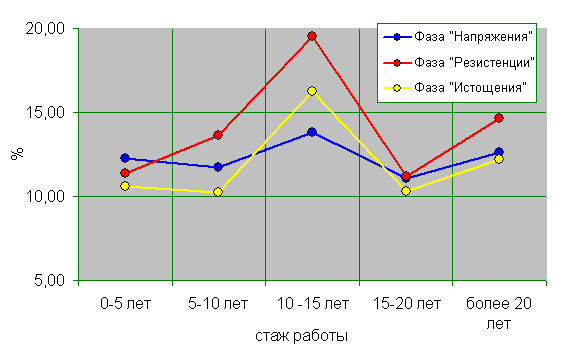 Анализируя показатели фаз на графиках, можно заметить, что в фазе “напряжения” наиболее высокие показатели, имеют педагоги со стажем работы: от 0 до 5 лет; от 10 до 15 лет и более 20 лет. В группах от 5 до 10 лет и от 15 до 20 показатели имеют более низкий уровень. В фазе “резистенции”, на графике мы видим постепенное возрастание уровня сопротивления от первой к третьей группе (от 0 до 15 лет), затем спад в группе педагогов со стажем работы от 15 до 20 лет и у педагогов со стажем работы более 20 лет этот уровень снова повышается. Фаза “истощения” наиболее ярко выражена у педагогов со стажем работы от 10 до 15 лет; затем у педагогов со стажем работы свыше 20 лет. И менее выражена у педагогов со стажем работы от 5 до 10 лет и от 15 до 20.